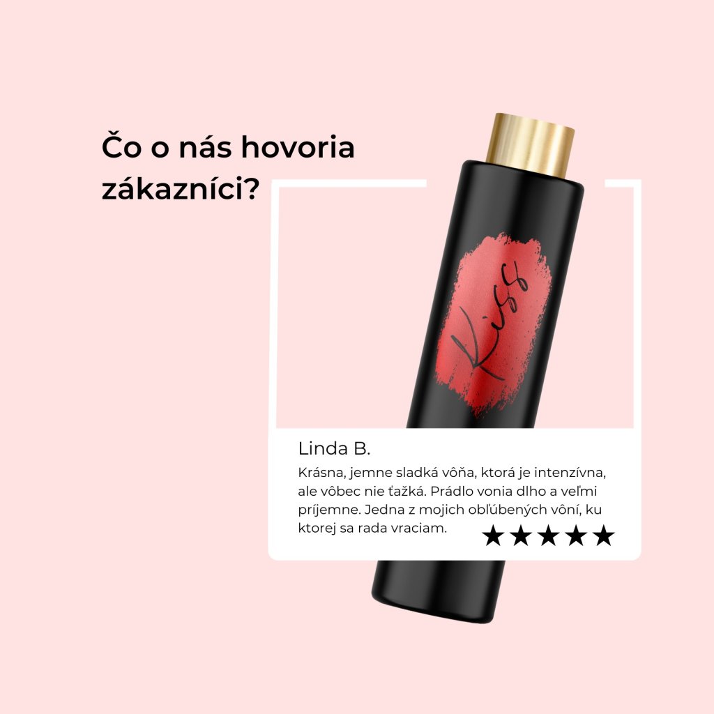 Esencia nežnosti: KISS je jemná ovocno-kvetinová vôňa s nádychom sladkosti, ktorá pôsobí romanticky, upokojujúco a zmyselne – ako prvé dotyky zamilovanosti.
